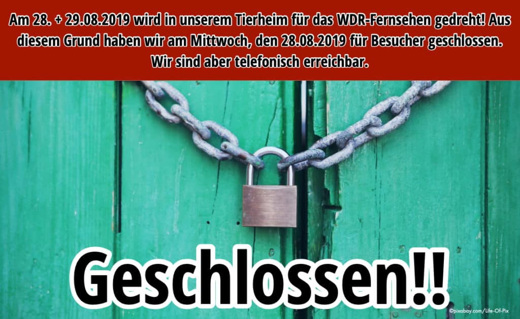 Am 28. + 29.08.2019 wird in unserem Tierheim für das WDR-Fernsehen gedreht! Aus diesem Grund haben wir am Mittwoch, den 28.08.2019 für Besucher geschlossen. Wir sind aber telefonisch erreichbar.