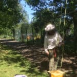 Samstag Nachmittag war einiges los im Kleintierdorf. Plötzlich hörten wir ein lautes Summen und ganz schnell war klar wo das herkam. Seit einiger Zeit gibt es im Tierheim Bienen und Samstag fingen sie an zu schwärmen. Zuerst flogen sie noch vor ihrem Bienenstock herum, dann machten sie sich auf und landeten alle hoch oben in einer Eiche. Sofort haben wir den Imker angerufen aber als er sah, wie weit oben sie saßen musste Plan B her. Zum Glück gab es einen schwindelfreien Kollegen mit kletterausrüstung. Der kam auch sofort und so begann die Rettungsaktion der Bienen. Und nach kurzer Zeit war ein Großteil der Bienen im Eimer verstaut, die restlichen versammelten sich nach kurzer Zeit auch zum den Eimer. Bienen gerettet!