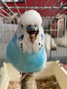 Vor ein paar Wochen fanden wir in unserer Voliere im Vogelhaus einen verletzten Wellensittich. Der arme Kerl saß am Boden in einer Ecke und blutete am Schnabel. Wir nahmen ihn heraus und sahen dann, dass sein Oberschnabel fast komplett abgebrochen war. Er hatte Schmerzen und konnte mit dieser Verletzung auch nicht mehr fressen. Da der Schnabel so gut wie ab war, entfernte unsere Tierärztin den Rest und Clemens bekam Schmerzmittel und Antibiotika. Zusätzlich reinigten wir seine Wunde mehrmals am Tag. Selbständiges fressen war nun leider nicht mehr möglich, deshalb wurde Clemens mit Päppelbrei extra für Papageien mehrmals am Tag über eine kleine Sonde direkt in den Kropf gefüttert. Da die Pflege der Wunde und auch das Füttern recht aufwändig war, nahm eine Kollegin aus der Kleintierabteilung den kleinen Kerl mit nach Hause. So konnte er auch bis spät abends noch das ein oder andere Mal gefüttert werden. Trotz dieser schweren Verletzung