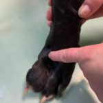 Unerzogen, nervig, defekt: weg damit. Aramis blieb also bei uns, alles andere wäre auch nicht vertretbar gewesen. Eine genauere Untersuchung zeigte, dass unten in dem verdickten, sehr harten Zeh eine große eiternde Wunde war. Heute wurde Aramis geröntgt. Der Zeh war gebrochen, dies aber schon vor einigen Wochen. Die Bruchenden hatten sich verschoben und alles war mit einer dicken Knochenwucherung völlig schief verwachsen. Eine Knochenspitze bohrte sich nach unten ins Gewebe und verursachte die Wunde unter dem Fuß. Verständlicherweise war jeder Schritt in den letzten Wochen für diesen Hund eine Qual.