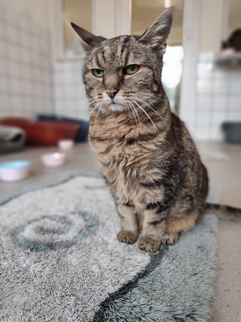 Wie bei vielen älteren Katzen, machen sich auch bei Crispy die Nieren bemerkbar. Sie braucht Nierenfutter, momentan reicht das auch aus. Im Verlauf ihres Lebens wird aber bestimmt noch das ein oder andere Medikament hinzukommen, dessen muss man sich bewusst sein.