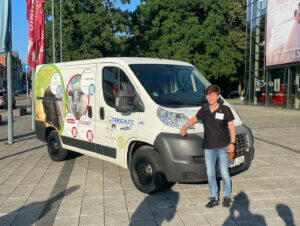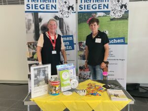 Einige Firmen von BNI waren ebenfalls mit einem Stand in der Siegerlandhalle vertreten. Plötzlich wurden Jutta und Brigitte angesprochen und bevor sie überhaupt verstanden hatten, was passierte, bekamen Sie von Jan Ehrenfried (www.klamottenalarm.de) eine tolle Überraschung: Ein großes Tierheim-Auto! Um unseren ungläubigen Damen die “Augen zu öffnen” gingen sie vor die Türe, wo der neue Tierheim-Transporter auf sie wartete: Der sehr geräumige Kastenwagen ist sogar schon – dank Sabrina Weis von der Autolackiererei Weis – beschriftet und mit ganz tollen Fotos unserer Tiere beklebt. Das Design des Flitzers hat dank Burkhard Daub von www.wort-bild-sinn.de ein farbenfrohes Aussehen mit Tieren aus unserem Tierheim bekommen.